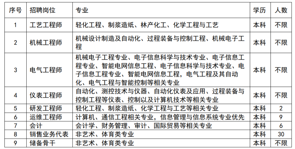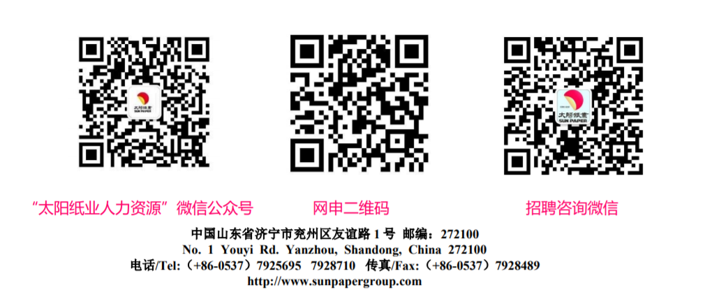 2、网站报名:请前往智联招聘/齐鲁人才网站,搜索“山东太阳纸业股份有限公司”,根据个人专业选择合适的岗位进行投递,简历中务必包含个人近期彩色照片、联系方式及邮箱;